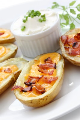 Adjust this Gluten Free Potato Skins with Cheese Sauce by substituting the bacon for thinly sliced ham. Just fry, or broil the ham in the oven, and to the top. Serve with a bowl of sour cream for dipping, if desired.