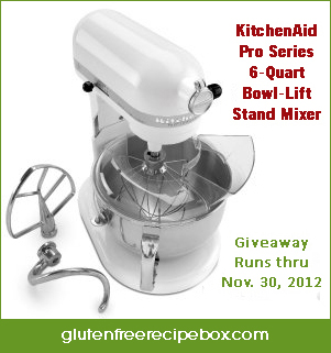Having created this blog over 2 years ago, it was not until recently did I realize just how popular it has become. In honor of its success, it seemed fitting to celebrate by sponsoring a KitchenAid Giveaway – a Professional Series 6-Quart Bowl-Lift Stand Mixer! – my favorite appliance. In addition, with the help of some top gluten-free authors, throughout the month of November they will be contributing a gluten-free recipe each day to help me celebrate. I hope you enjoy them, as they all look scrumptious! Now let’s get this online gluten-free party started! And be sure to check all of the current Gluten Free Giveaways. THIS GIVEAWAY HAS ENDED.