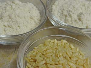 Rice: Both white and brown rice may be ground in the KitchenAid Grain Mill. Rice flour may be used in a 50% to starch in gluten free recipes.