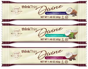 Think Thin – Think Thin’s newest product line is their Devine coconut bars – a good source of fiber and protein. Coconut is a very healthy fat! They are available in Dark Chocolate Coconut, Mint Chocolate Coconut, and German Chocolate Coconut. I tasted their Dark Chocolate Coconut bar. It was chewy and coated with a luscious dark chocolate – like a Mounds, but natural and healthier for you! Manufactured in a facility that also processes Tree Nuts, Peanuts and Eggs.